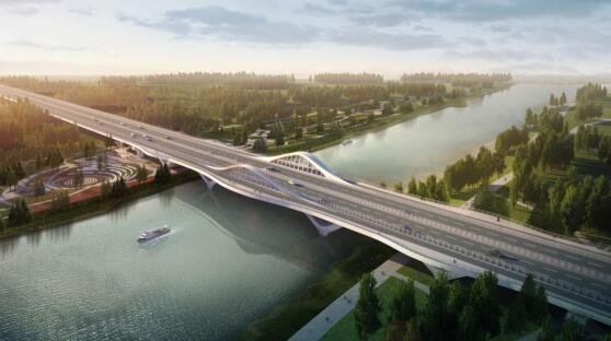 安運(yùn)橋主橋設(shè)計采用梁-拱型組合體系,立意荷香,將荷葉形態(tài)融入到橋梁造型當(dāng)中,荷葉浮于運(yùn)河之上,整個造型宛如運(yùn)河上盛開的荷花,生態(tài)自然,與環(huán)境融為一體,給人以生機(jī)盎然、自然和諧的美感。