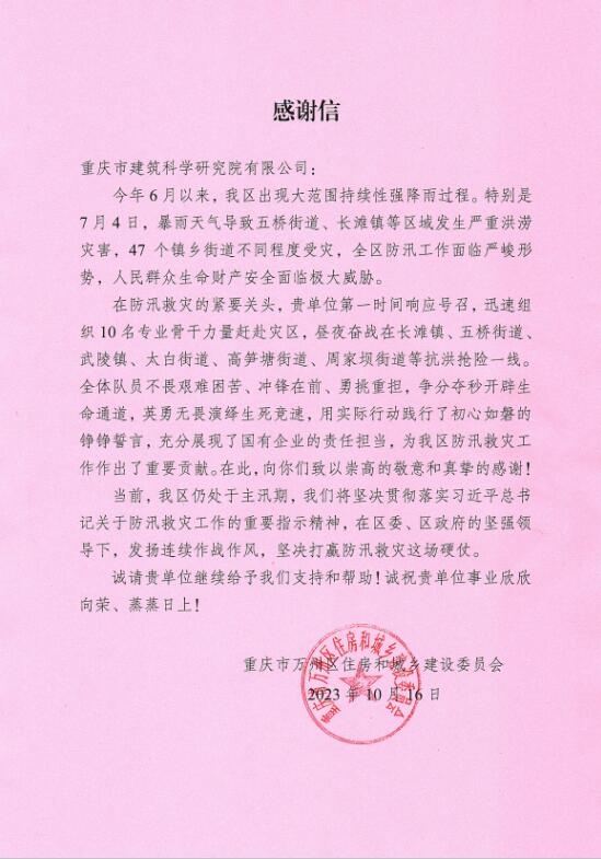 近日,重慶市建筑科學研究院有限公司收到來自重慶市萬州區住房和城鄉建設委員會的感謝信,信中對市建科院在今年7萬州暴雨災后防汛救災工作中所做出的貢獻致以敬意和感謝。