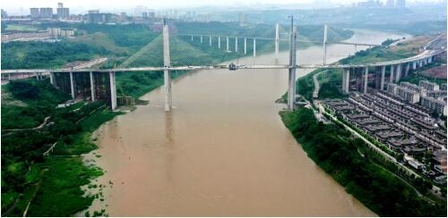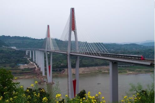 蔡家嘉陵江軌道專用橋為雙線軌道雙索面斜拉橋,全長1250米,由南北引橋和主橋組成,橋跨為連續(xù)梁、雙索面斜拉橋、連續(xù)鋼構(gòu)引橋組成,其中主橋長640米、主跨250米、主橋面距河床距離100米。在設(shè)計時兼顧了功能性、景觀性以及可實施性,最終選擇了與環(huán)境協(xié)調(diào),經(jīng)濟實惠、施工可實施性強的斜拉橋,由于橋墩高、橋面窄,主橋?qū)挾认鄬τ谄胀ǖ目缃反髽蚋瑯蛏盹@得纖細,在云霧中呈現(xiàn)婀娜多姿的柔美姿態(tài)。