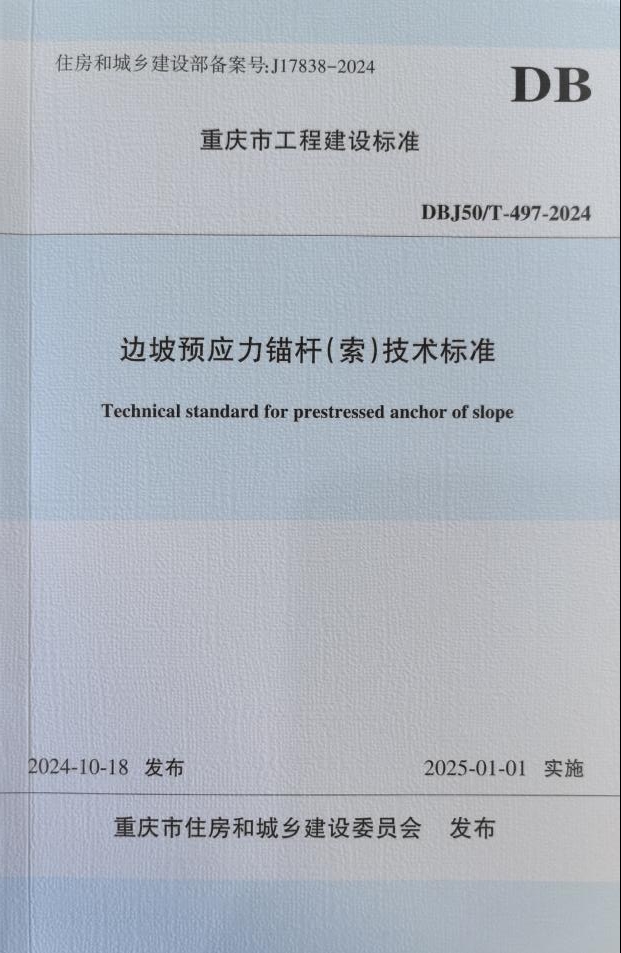 經(jīng)市住房城鄉(xiāng)建委批準(zhǔn),由市建科院主編的重慶地方標(biāo)準(zhǔn)《邊坡預(yù)應(yīng)力錨桿(索)技術(shù)標(biāo)準(zhǔn)》(DBJ50/T-497-2024)將于2025年1月1日起施行。